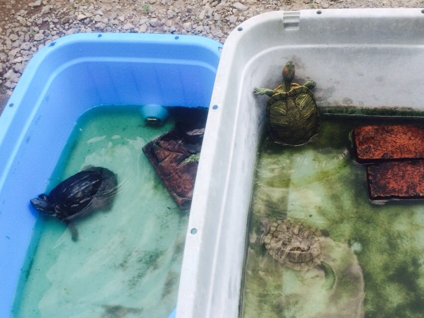 このミドリガメとゼニガメは小さな子どもたちから大人気です。