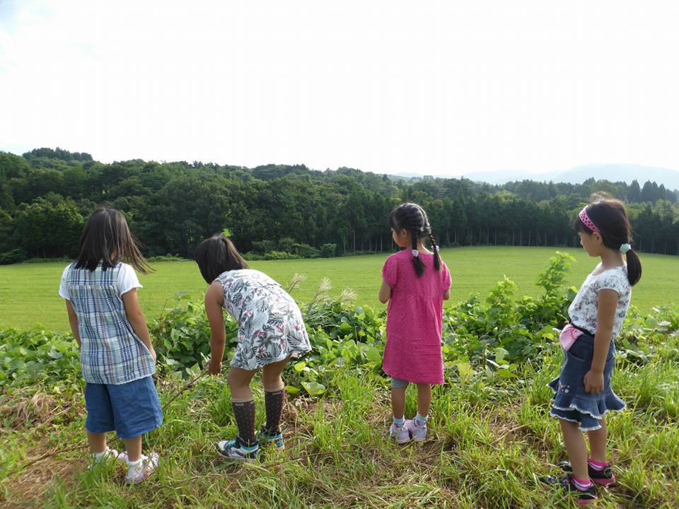 躍動感のある男の子たちのジャンプと,お花を摘む女の子たちの様子です。