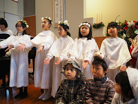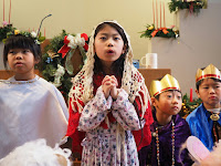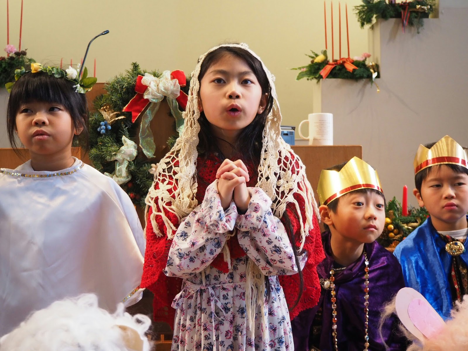 はるばる遠くからイエス様を拝むために旅をしてきた博士や羊飼いと動物たち、イエス様のご降誕をお祝いする天使たち、マリヤ、そしてナレーターと、それぞれの役割をかわいく、立派に演じてくれました。