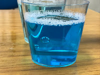 洗剤を数滴たらした水をストロで少しだけ取ってたらすと、このように薄い空気の膜のシャボン玉が水中にできるんです。