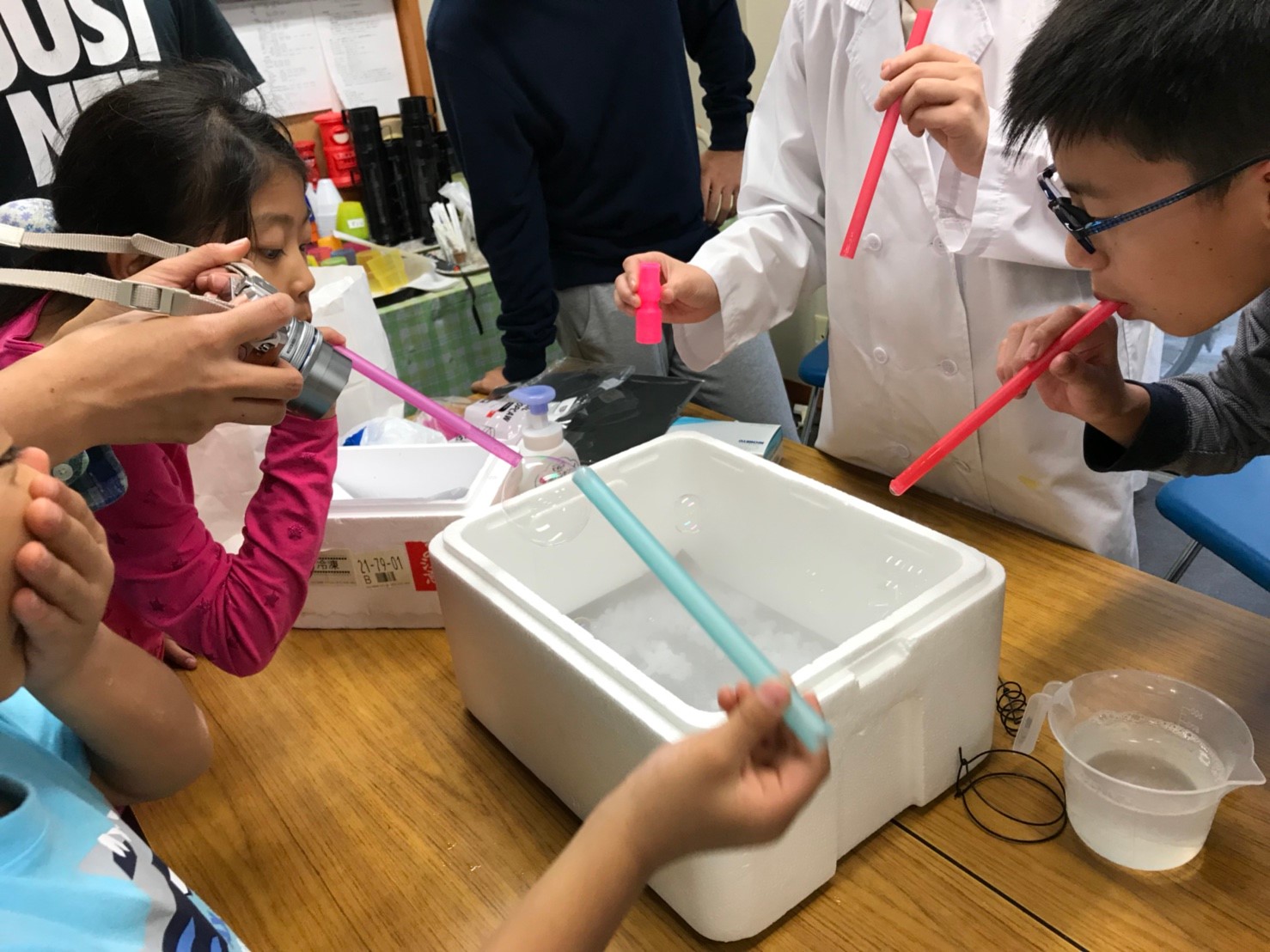二酸化炭素は空気より重いので、シャボン玉が沈まずに浮くんです!