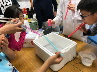 次にドライアイスの入った箱の中にシャボン玉を吹きました。