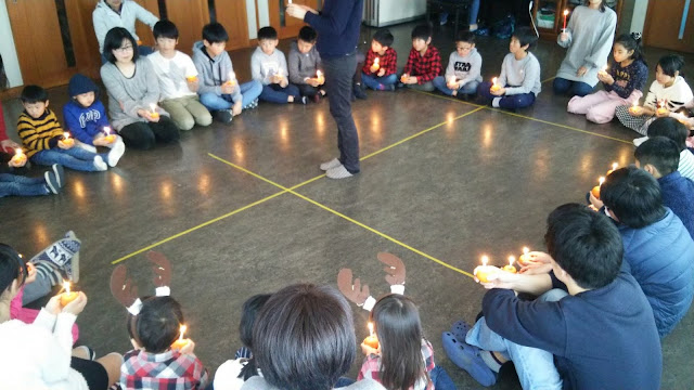みかんに差したろうそくに火をともして「きよしこの夜」を歌いました♪