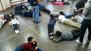 ではなく、人文字ゲームです。チームごとにお題のひらがなを作っています。