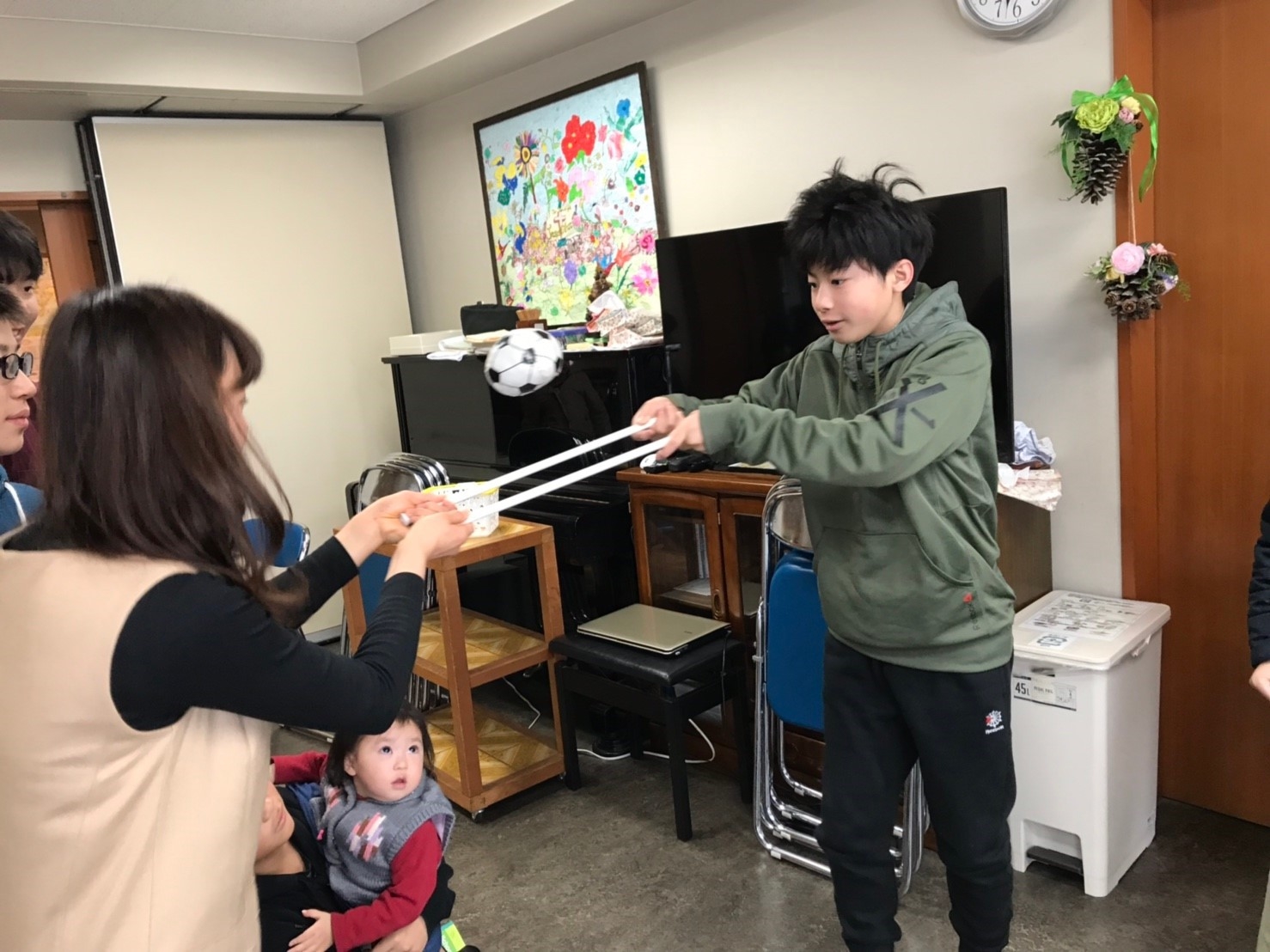 かごや段ボール、棒を使って、飛んできたボールをキャッチするゲームです!