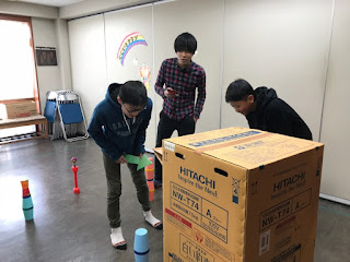 段ボール箱に入る役と誘導役に分かれ、障害物を避けながら、いかに早くゴールできるかを競いました!