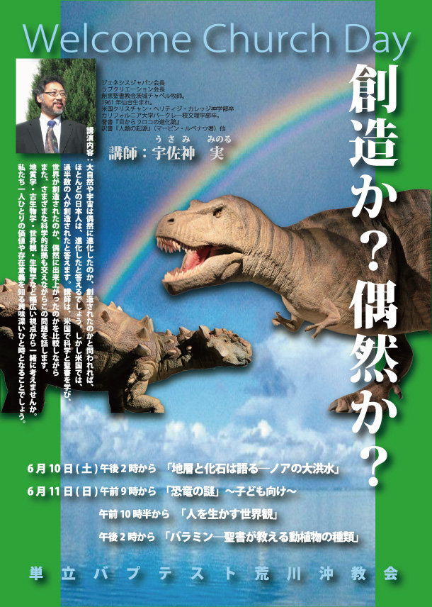 「大自然や宇宙は偶然に進化したのか、創造されたのかと問われれば、ほとんどの日本人は、進化したと答えるでしょう。しかし米国では、過半数の人が創造されたと答えます。講師は、米国で科学と聖書を学び、世界が創造されたのか、偶然に出来上がったのかを比較しながら、また、さまざまな科学的証拠も交えながらこの問題を話します。地質学・古生物学・世界観・生物学など幅広い視点から一緒に考えませんか。私たち一人ひとりの価値や存在意義を知る興味深いひと時となることでしょう。」
